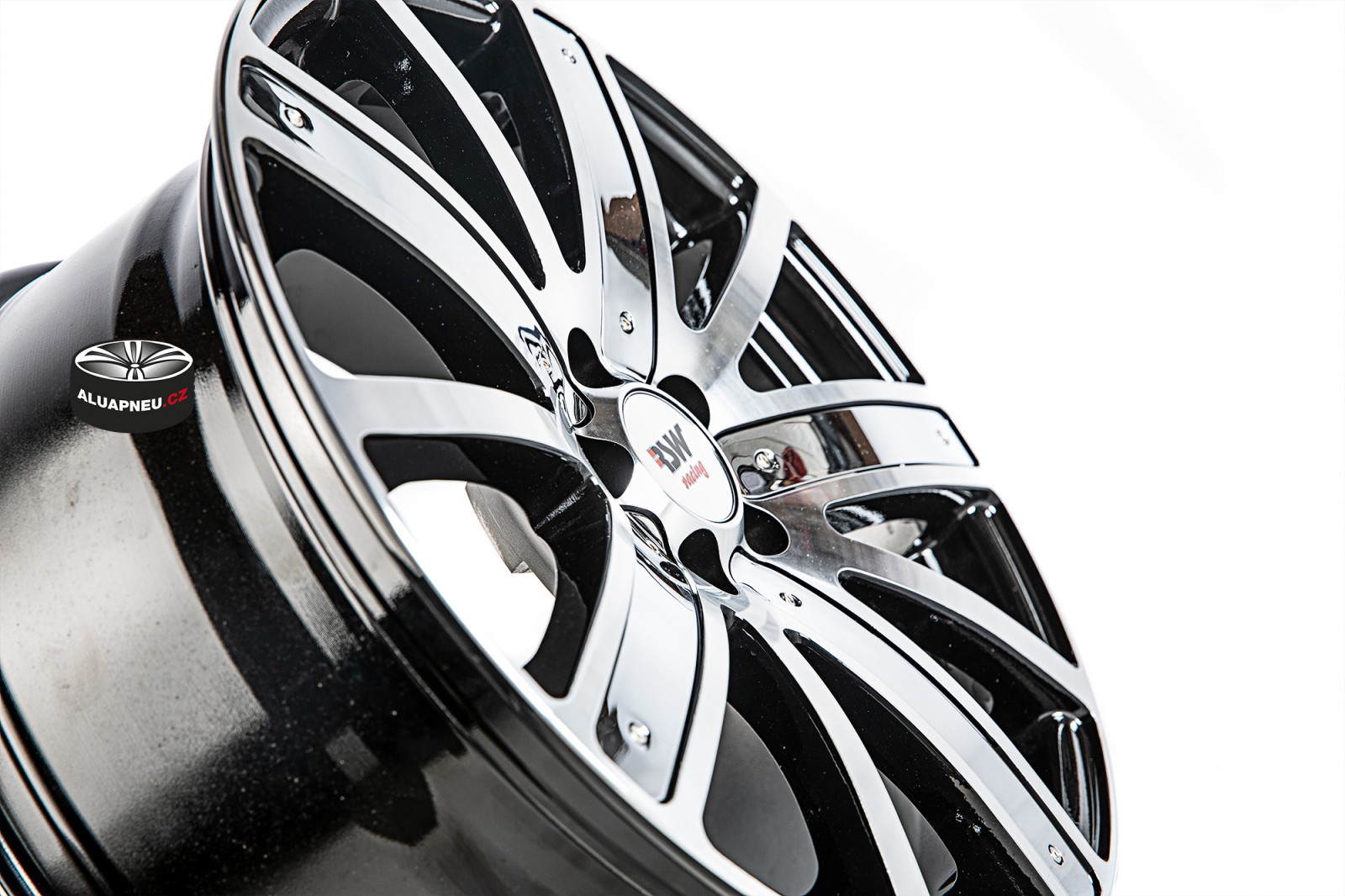 ČERNÁ ALU KOLA S LEŠTĚNÝM ČELEM A CHROMOVÝMI DESTIČKAMI V PAPRSKU